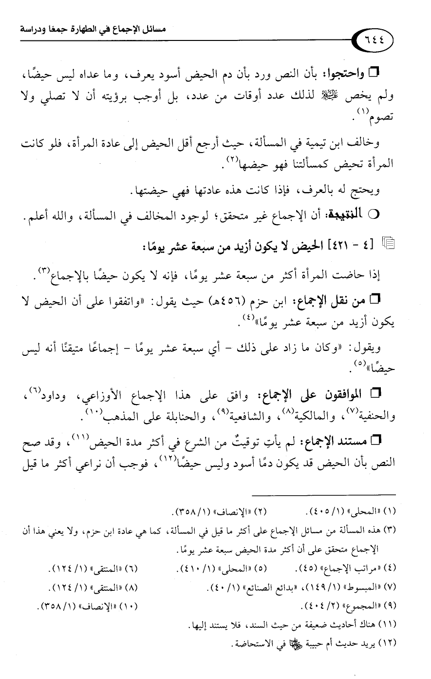 • من نقل الإجماع: ابن حزم (456 هـ) حيث يقول: "واتفقوا على أن الحيض لا يكون أزيد من سبعة عشر يومًا" (¬4).