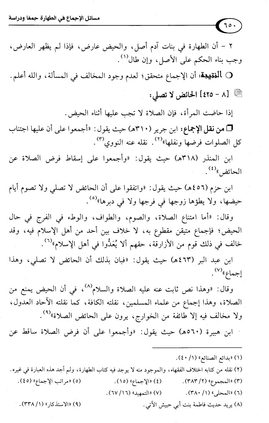 ابن عبد البر (463 هـ) حيث يقول: "فبان بذلك أن الحائض لا تصلي، وهذا إجماع" (¬7).