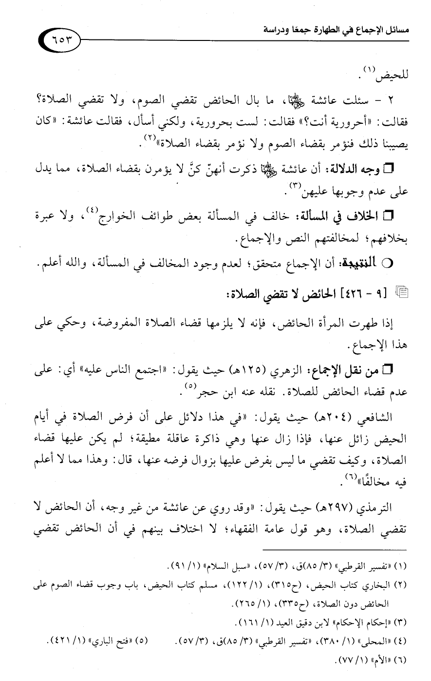 الترمذي (297 هـ) حيث يقول: "وقد روي عن عائشة من غير وجه، أن الحائض لا تقضي الصلاة، وهو قول عامة الفقهاء؛ لا اختلاف بينهم في أن الحائض تقضي