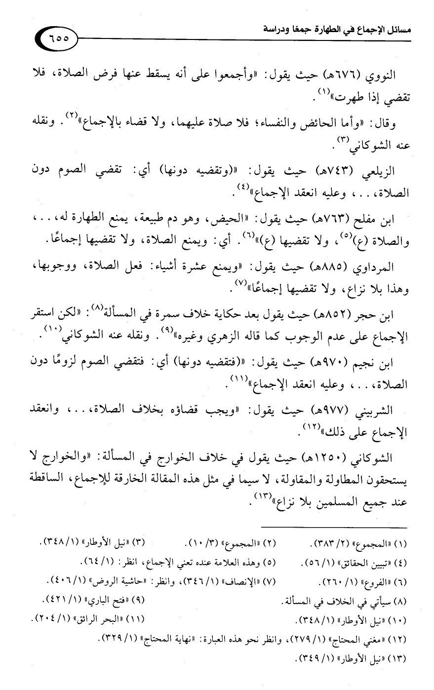 ابن مفلح (763 هـ) حيث يقول: "الحيض، وهو دم طبيعة، يمنع الطهارة له، . .، والصلاة (ع) (¬5)، ولا تقضيها (ع) " (¬6). أي: ويمنع الصلاة، ولا تقضيها إجماعًا.