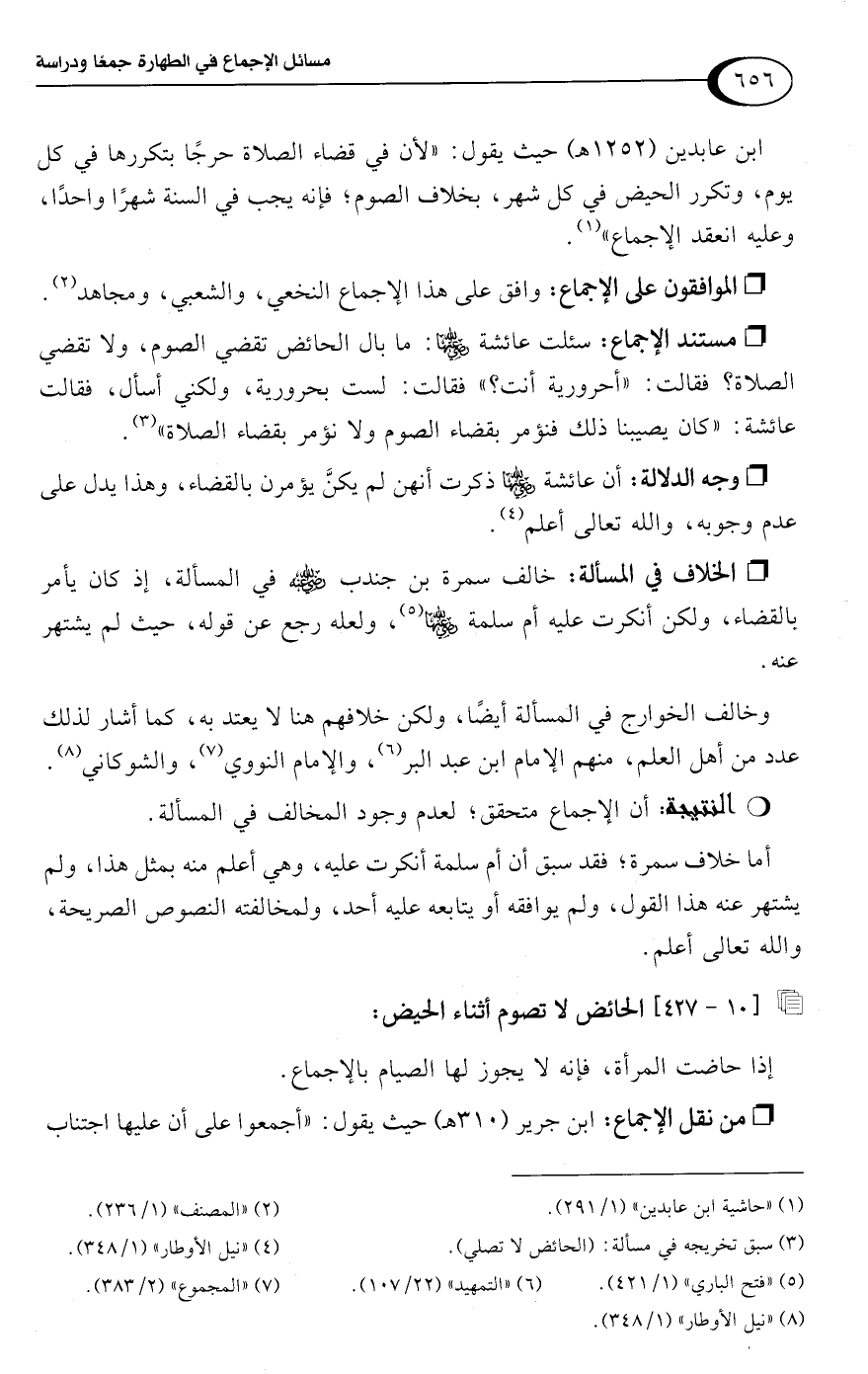 • مستند الإجماع: سئلت عائشة -رضي اللَّه عنها-: ما بال الحائض تقضي الصوم، ولا تقضي الصلاة؟ فقالت: "أحرورية أنت؟ " فقالت: لست بحرورية، ولكني أسأل، فقالت عائشة: "كان يصيبنا ذلك فنؤمر بقضاء الصوم ولا نؤمر بقضاء الصلاة" (¬3).