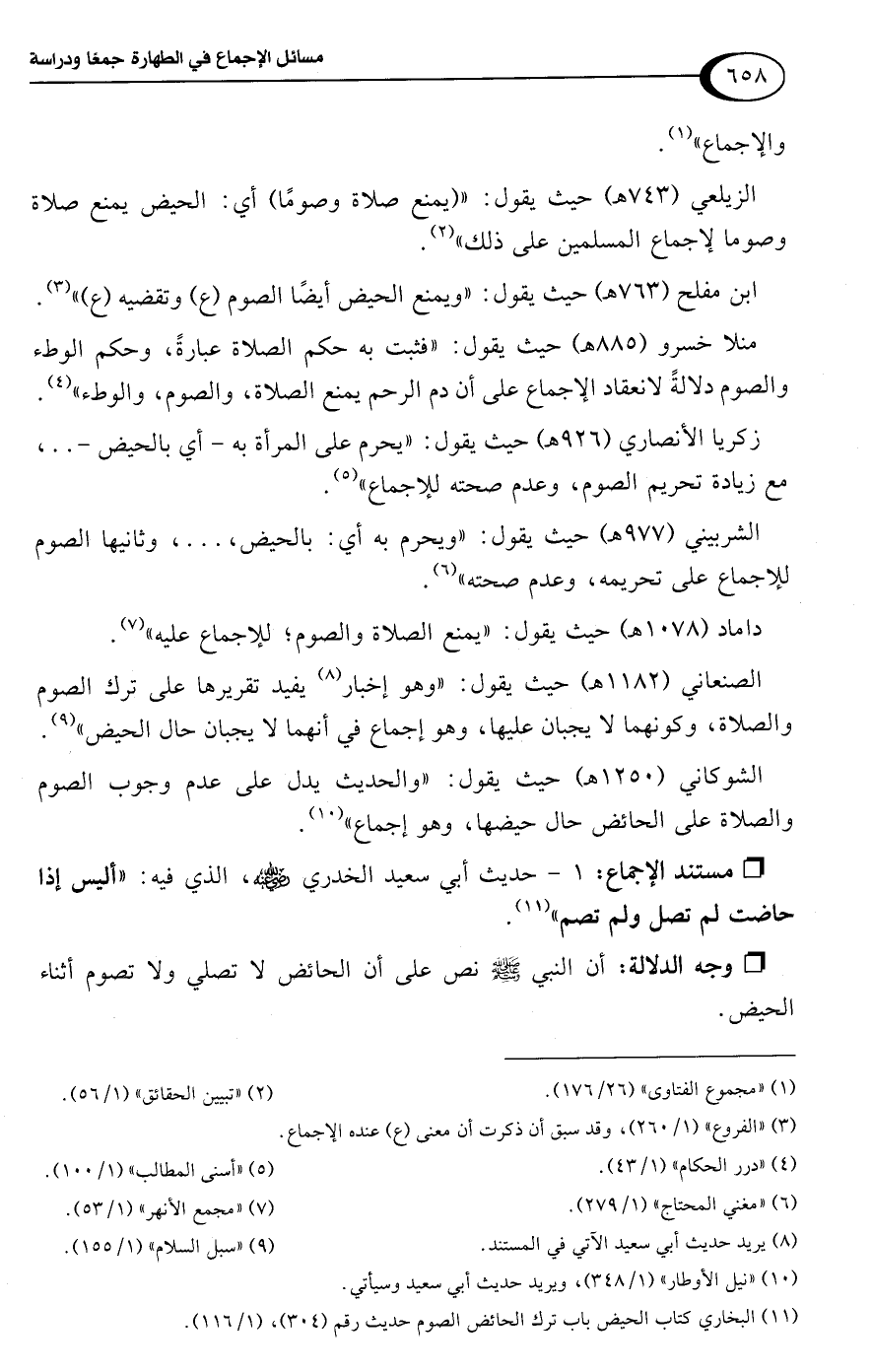 الشوكاني (1250 هـ) حيث يقول: "والحديث يدل على عدم وجوب الصوم والصلاة على الحائض حال حيضها، وهو إجماع" (¬10).