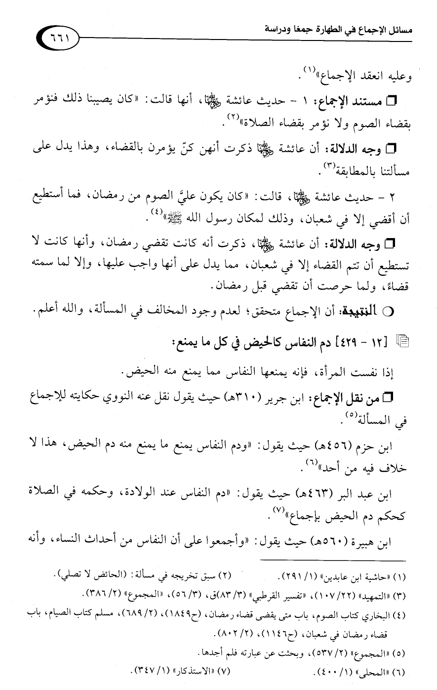 ابن عبد البر (463 هـ) حيث يقول: "دم النفاس عند الولادة، وحكمه في الصلاة كحكم دم الحيض بإجماع" (¬7).