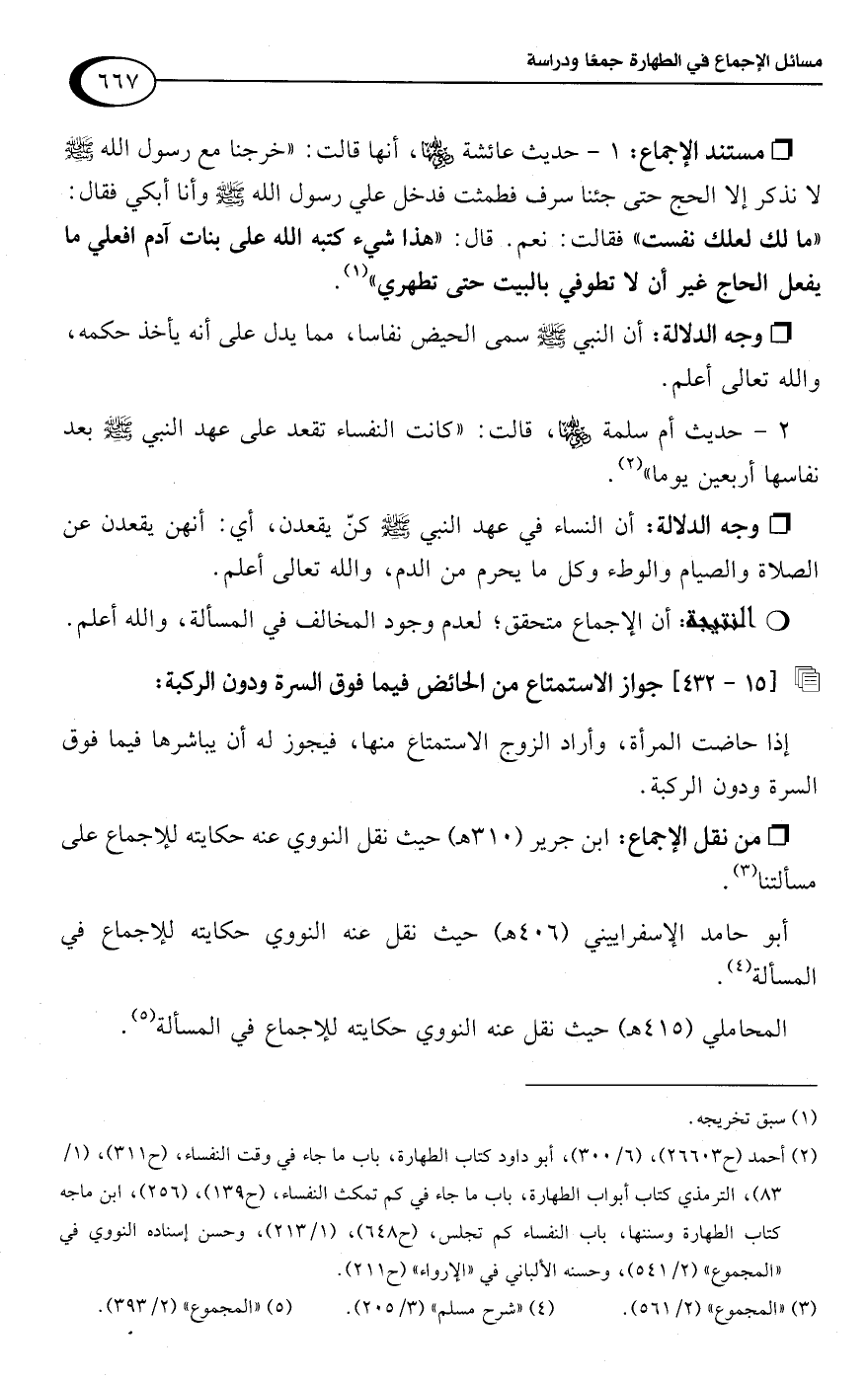 • وجه الدلالة: أن النساء في عهد النبي -صلى اللَّه عليه وسلم- كنّ يقعدن، أي: أنهن يقعدن عن الصلاة والصيام والوطء وكل ما يحرم من الدم، واللَّه تعالى أعلم.Rأن الإجماع متحقق؛ لعدم وجود المخالف في المسألة، واللَّه أعلم.