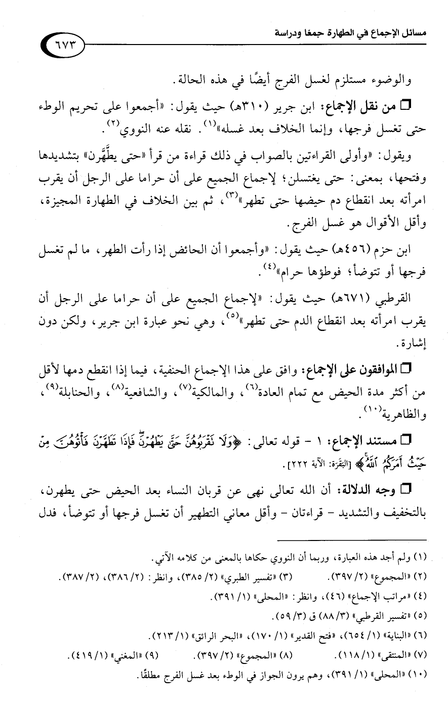 ابن حزم (456 هـ) حيث يقول: "وأجمعوا أن الحائض إذا رأت الطهر، ما لم تغسل فرجها أو تتوضأ؛ فوطؤها حرام" (¬4).