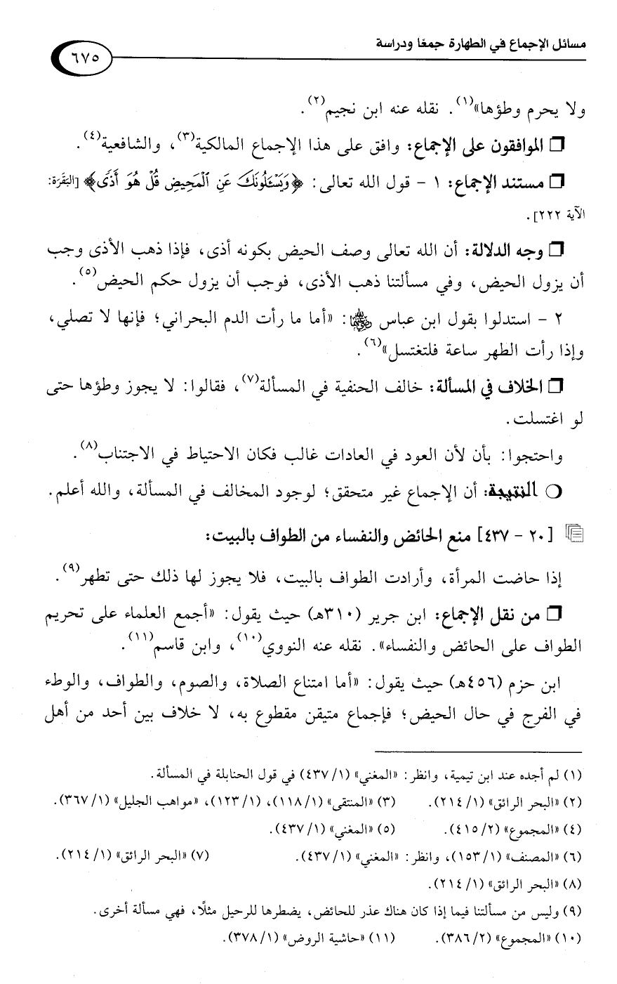 • من نقل الإجماع: ابن جرير (310 هـ) حيث يقول: "أجمع العلماء على تحريم الطواف على الحائض والنفساء". نقله عنه النووي (¬10)، وابن قاسم (¬11).
