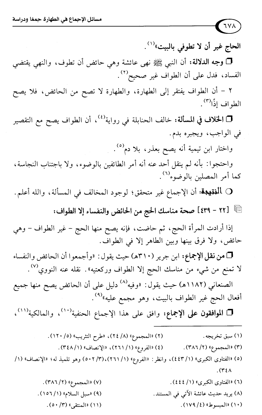 واحتجوا: بأنه لم ينقل أحد عنه أنه أمر الطائفين بالوضوء، ولا باجتناب النجاسة، كما أمر المصلين بالوضوء (¬6).Rأن الإجماع غير متحقق؛ لوجود المخالف في المسألة، واللَّه أعلم.