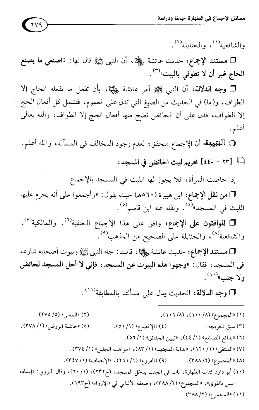 • من نقل الإجماع: ابن هبيرة (560 هـ) حيث يقول: "وأجمعوا على أنه يحرم عليها اللبث في المسجد" (¬4). ونقله عنه ابن قاسم (¬5).