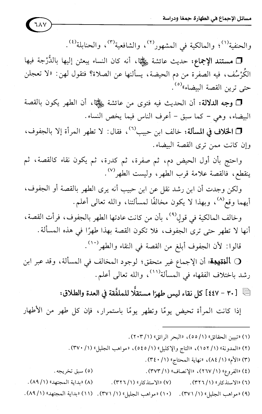 • مستند الإجماع: حديث عائشة -رضي اللَّه عنها-، أنه كان النساء يبعثن إليها بالدُّرْجة فيها الكُرْسُف، فيه الصفرة من دم الحيضة، يسألنها عن الصلاة؟ فتقول لهن: "لا تعجلن حتى ترين القصة البيضاء" (¬5).