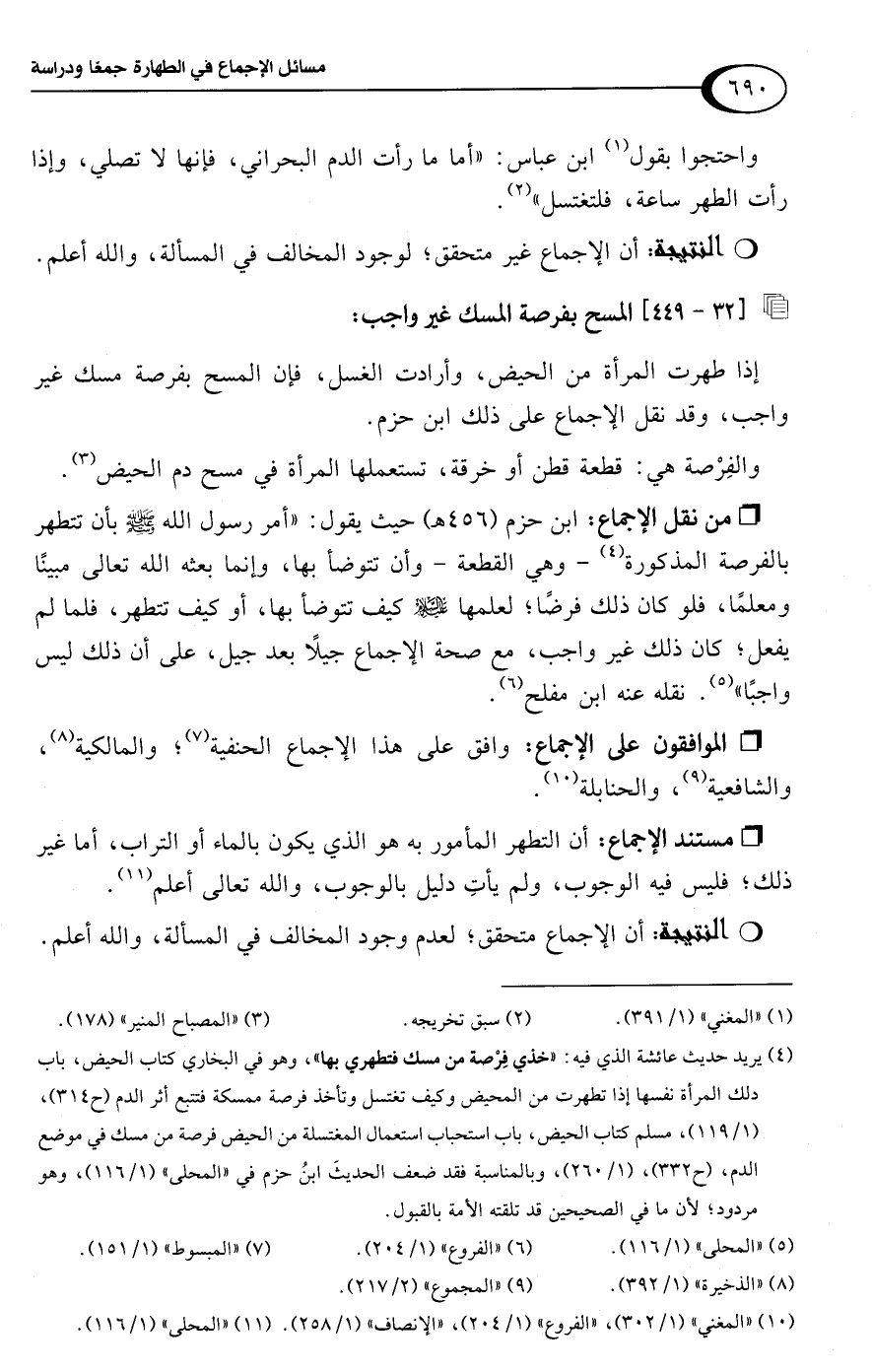 • من نقل الإجماع: ابن حزم (456 هـ) حيث يقول: "أمر رسول اللَّه -صلى اللَّه عليه وسلم- بأن تتطهر بالفرصة المذكورة (¬4) -وهي القطعة- وأن تتوضأ بها، وإنما بعثه اللَّه تعالى مبينًا ومعلمًا، فلو كان ذلك فرضًا، لعلمها عليه السلام كيف تتوضأ بها، أو كيف تتطهر، فلما لم يفعل؛ كان ذلك غير واجب، مع صحة الإجماع جيلًا بعد جيل، على أن ذلك ليس واجبًا" (¬5). نقله عنه ابن مفلح (¬6).
