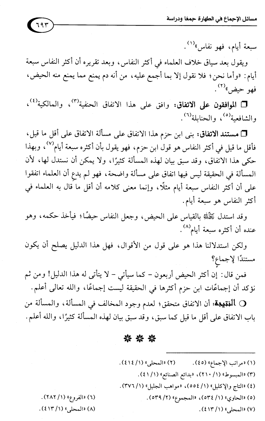 فمن قال: إن أكثر الحيض أربعون -كما سيأتي- لا يتأتى له هذا الدليل! ومن ثم نؤكد أن إجماعات ابن حزم أكثرها في الحقيقة ليست إجماعًا، واللَّه تعالى أعلم.Rأن الاتفاق متحقق؛ لعدم وجود المخالف في المسألة، والمسألة من باب الاتفاق على أقل ما قيل كما سبق، وقد سبق بيان لهذه المسألة كثيرًا، واللَّه أعلم.