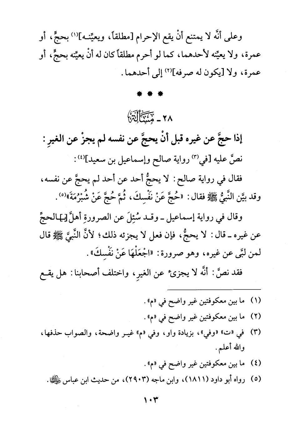 فقال في رواية صالح: لا يحج أحد عن أحد لم يحج عن نفسه، وقد بين النبي صلى الله عليه وسلم فقال: «حج عن نفسك، ثم حج عن شبرمة».