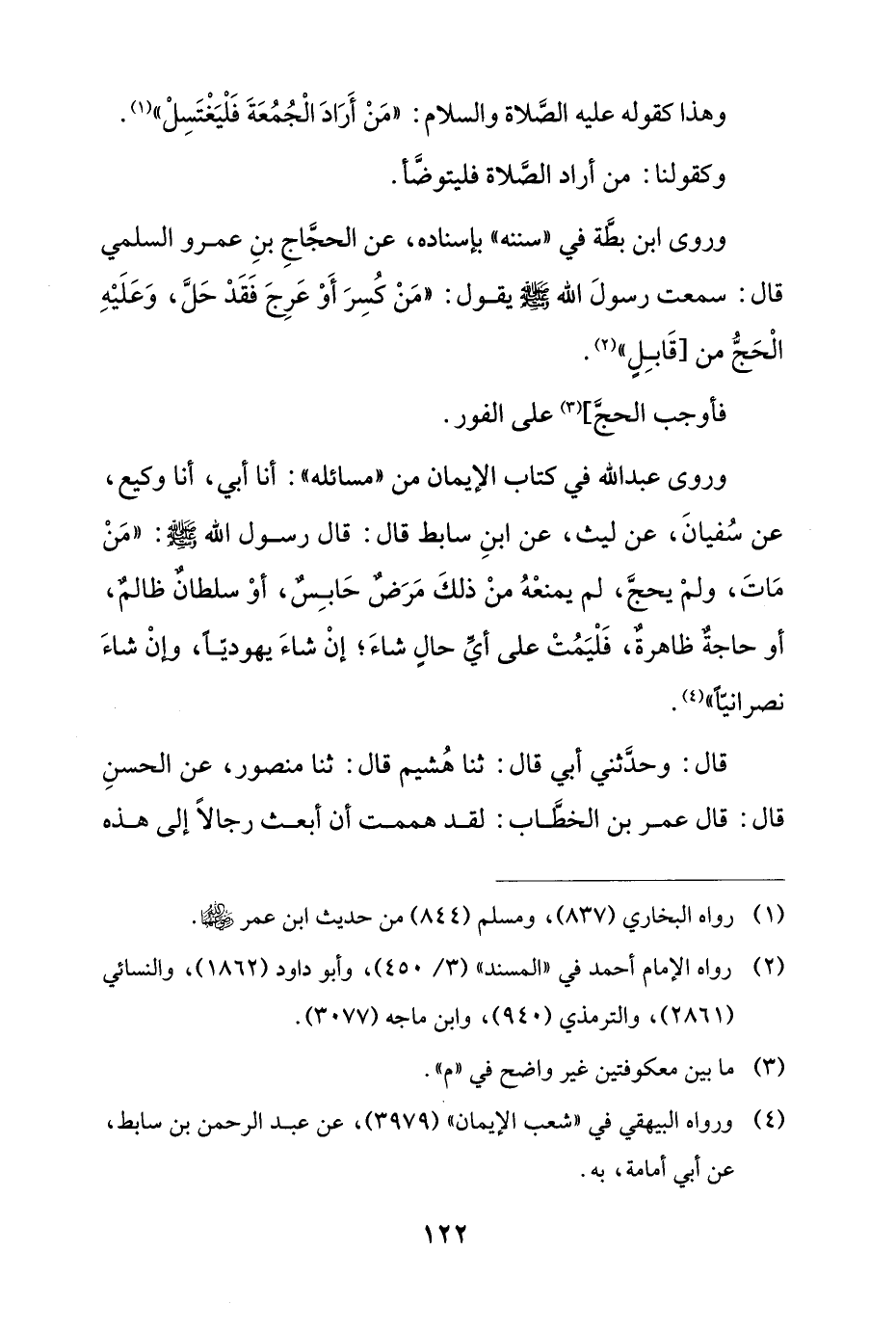 وروى عبد الله في كتاب الإيمان من "مسائله": أنا أبي، أنا وكيع، عن سفيان، عن ليث، عن ابن سابط قال: قال رسول الله صلى الله عليه وسلم: "من مات، ولم يحج، لم يمنعه من ذلك مرٌض حابٌس، أو سلطاٌن ظالٌم، أو حاجٌة ظاهرٌة، فليمت على أي حاٍل شاء، إن شاء يهوديًا، وإن شاء نصرانيًا".