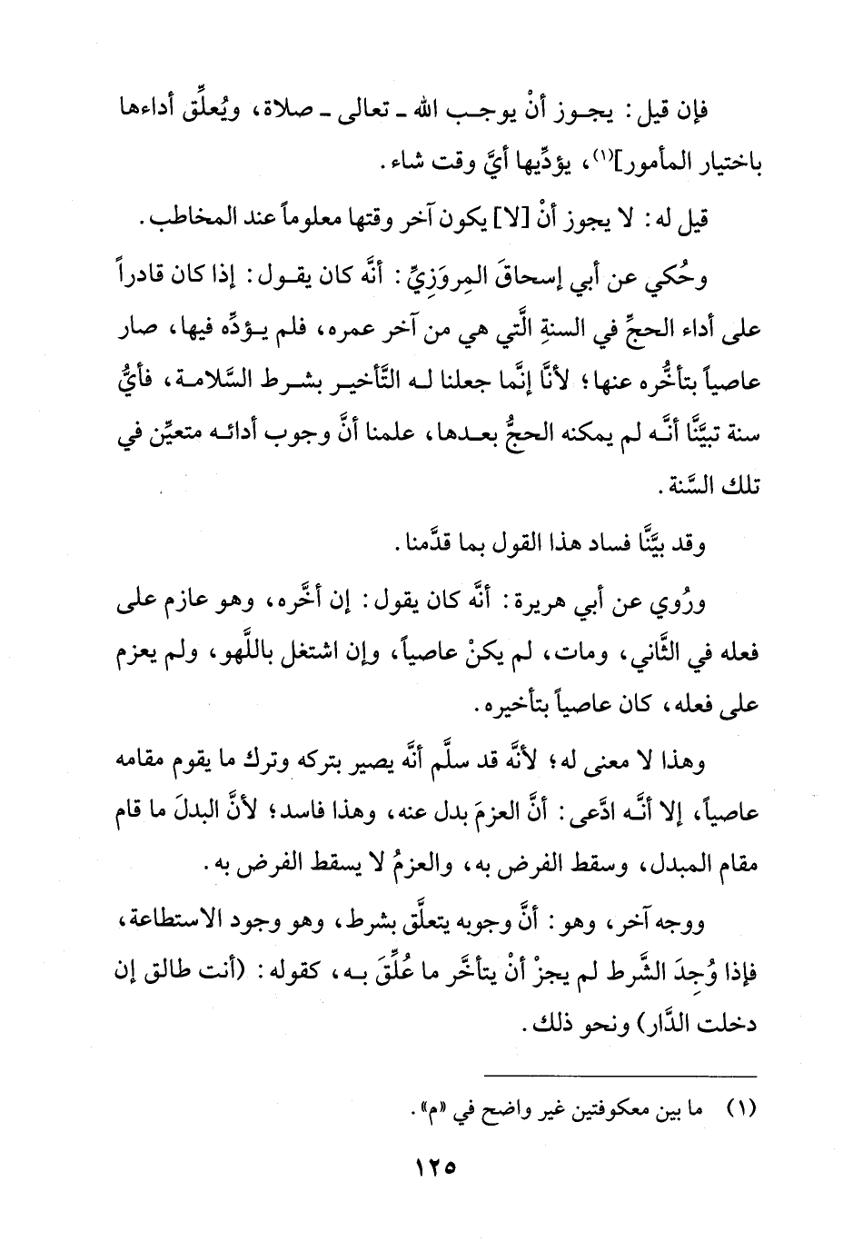 وروى عن أبي هريرة: أنه كان يقول: إن أخره، وهو عازم على فعله في الثاني، ومات، لم يكن عاصيًا، وإن اشتغل باللهو، ولم يعزم على فعله، كان عاصيًا بتأخيره.