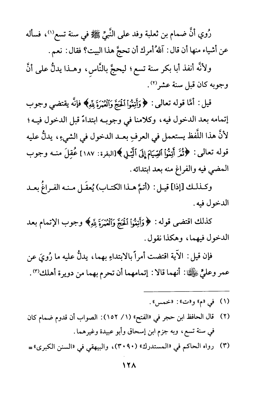 قيل: أما قوله تعالى: {وَأَتِمُّوا الْحَجَّ وَالْعُمْرَةَ لِلَّهِ} فإنه يقتضي وجوب إتمامه بعد الدخول فيه، وكلامنا في وجوبه ابتداًء قبل الدخول فيه، لأن هذا اللفظ يستعمل في العرف بعد الدخول في الشيء، يدل عليه قوله تعالى: {ثُمَّ أَتِمُّوا الصِّيَامَ إِلَى اللَّيْلِ} [البقرة:187] عقل منه وجوب المضي فيه والفراغ منه بعد ابتدائه.