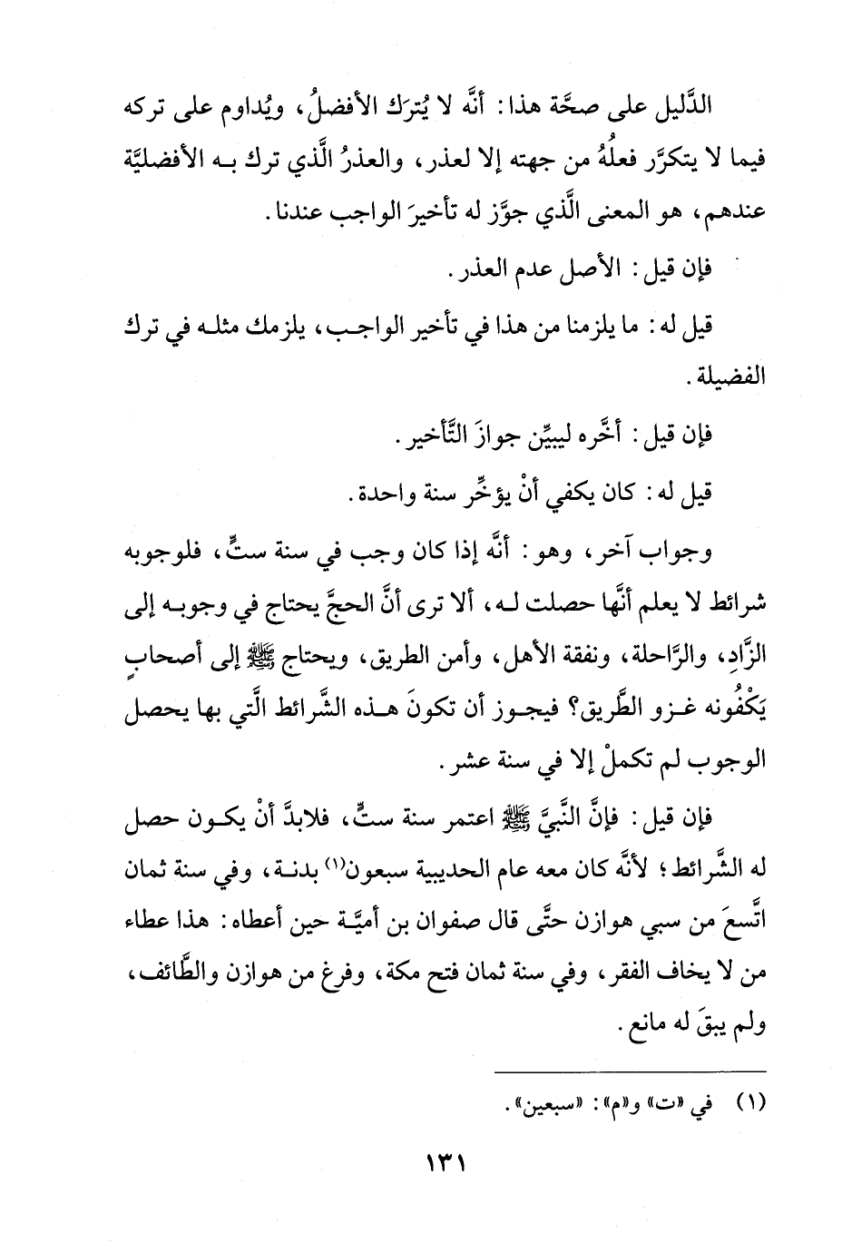 فإن قيل: فإن النبي (صلى الله عليه وسلم) اعتمر سنة ست، فلا بد أن يكون حصل له الشرائط؛ لأنه كان معه عام الحديبية سبعون بدنه، وفي سنة ثمان اتسع من سبي هوازن حتى قال صفوان بن أمية حين أعطاه" هذا عطاء من لا يخاف الفقر، وفي سنة ثمان فتح مكة، وفرغ من هوازن والطائف، ولم يبق له مانع.