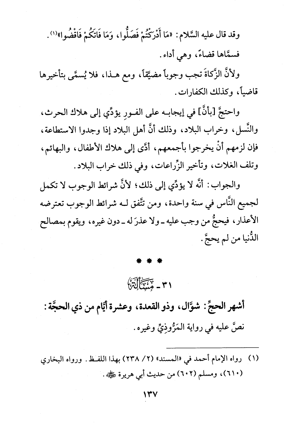 واحتج [بأن] في إيجابية على الفور يؤدي إلى هلاك الحرث، والنسل، وخراب البلاد، وذلك أن أهل البلاد إذا وجدوا الاستطاعة، فإن لزمهم أن يخرجوا بأجمعهم، أدى إلى هلاك الأطفال، والبهائم، وتلف الغلات، وتأخير الزراعات، وفي ذلك خراب البلاد.