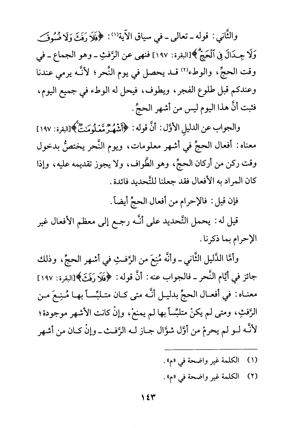 وأما الدليل الثاني- وأنه منع من الرفث في أشهر الحج، وذلك جائز في أيام النحر- فالجواب عنه: أن قوله: {فَلا رَفَثَ} [البقرة: 197] معناه: في أفعال الحج بدليل أنه متى كان متلبساً بها منع من الرفث، ومتى لم يكن متلبساً بها لم يمنع، وإن كانت الأشهر موجودة؛ لأنه لو لم يحرم من أول شوال جاز له الرفث- وإن كان من أشهر