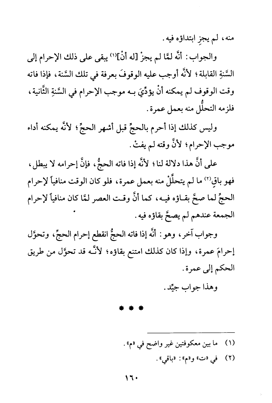 وجواب آخر, وهو: أنه إذا فاته الحج انقطع إحرام الحج, وتحول إحرام عمرة, وإذا كان كذلك امتنع بقاؤه؛ لأنه قد تحول من طريق الحكم إلى عمرة.