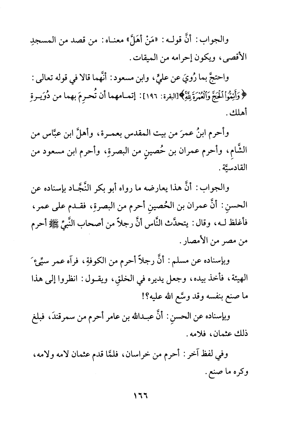 وأحرم ابن عمر من بيت المقدس بعمرة, وأهل ابن عباس من الشام, وأحرم عمران بن حصيٍن من البصرة, وأحرم ابن مسعود من القادسية.