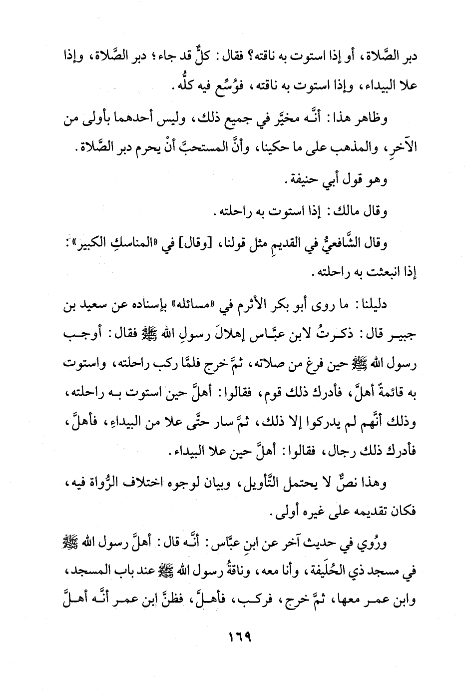 وروي في حديث آخر عن ابن عباس: أنه قال: أهل رسول الله صلى الله عليه وسلم في مسجد ذي الحليفة, وأنا معه, وناقة رسول الله صلى الله عليه وسلم عند باب المسجد, وابن عمر معها, ثم خرج, فركب, فأهل, فظن ابن عمر أنه أهل