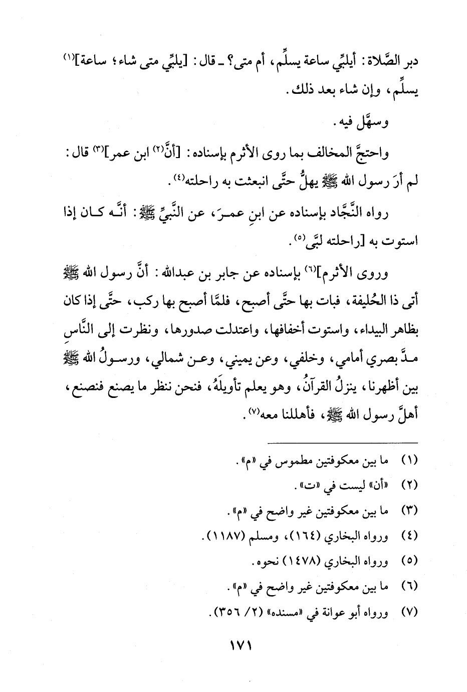وروى الأثرم [بإسناده عن جابر بن عبد الله: أن رسول الله صلى الله عليه وسلم أتى ذا الحليفة فبات بها حتى أصبح, فلما أصبح بها ركب, حتى إذا كان بظاهر البيداء, واستوت أخفافها, واعتدلت صدورها, ونظرت إلى الناس مد بصري أمامي, وخلفي, وعن يميني, وعن شمالي, ورسول الله صلى الله عليه وسلم بين أظهرنا, ينزل القرآن, وهو يعلم تأويله, فنحن ننظر ما يصنع فنصنع, أخل رسول الله صلى الله عليه وسلم, فأهللنا معه.