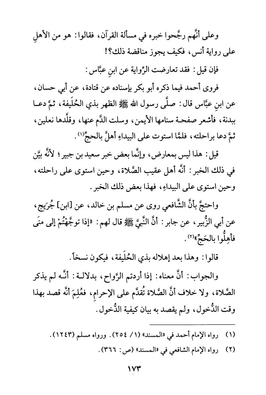 واحتج بأن الشافعي روى عن مسلم بن خالد, عن [ابن] جريج, عن أبي الزبير, عن جابر: أن النبي صلى الله عليه وسلم قال لهم: ((إذا توجهتم إلى منى فأهلوا بالحج)).