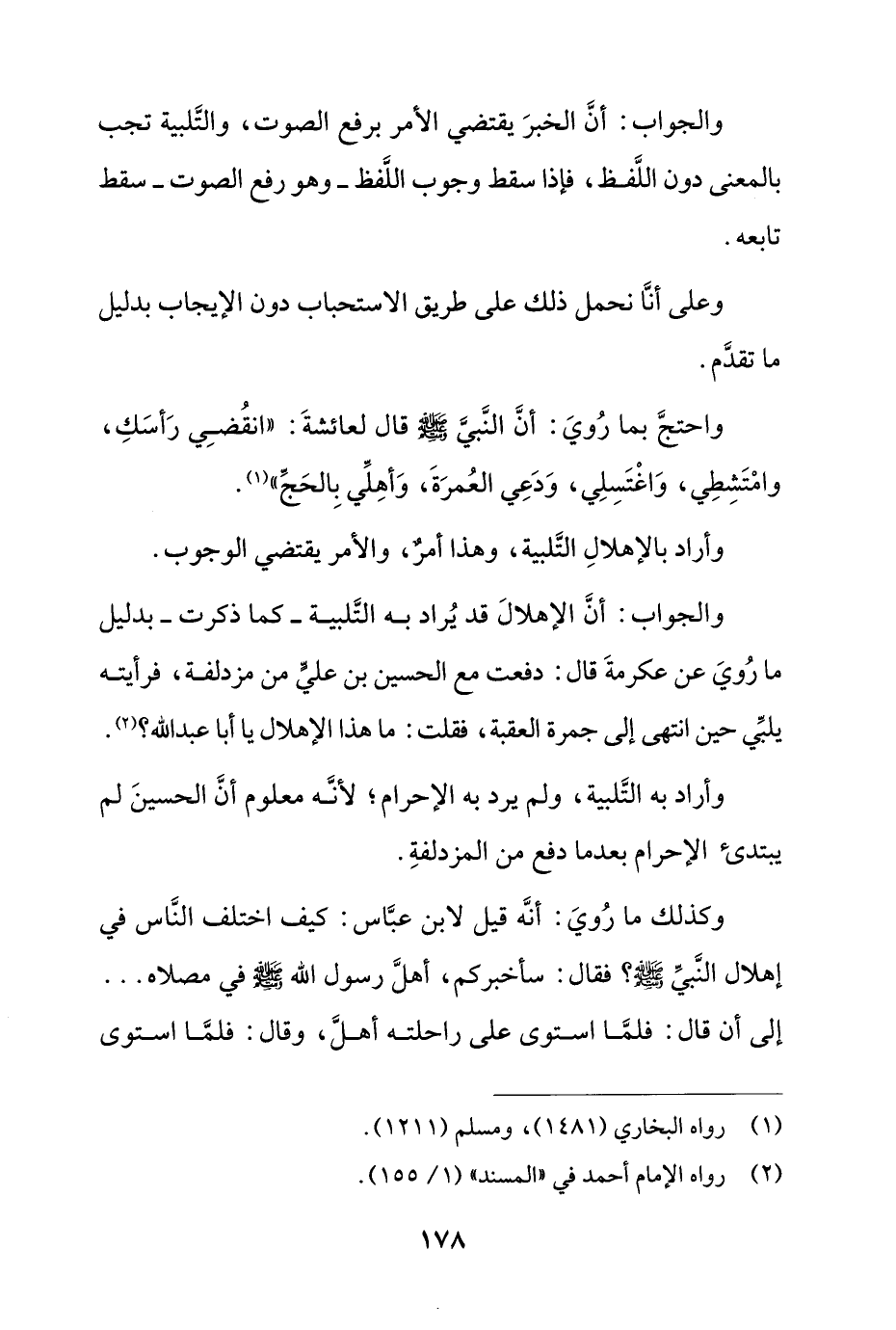 والجواب: أن الإهلال قد يراد به التلبية- كما ذكرت- بدليل ما روي عن عكرمة قال: دفعت مع الحسين بن علي من مزدلفة, فرأيته يلبي حين انتهى إلى جمرة العقبة, فقلت: ما هذا الإهلال يا أبا عبد الله؟.