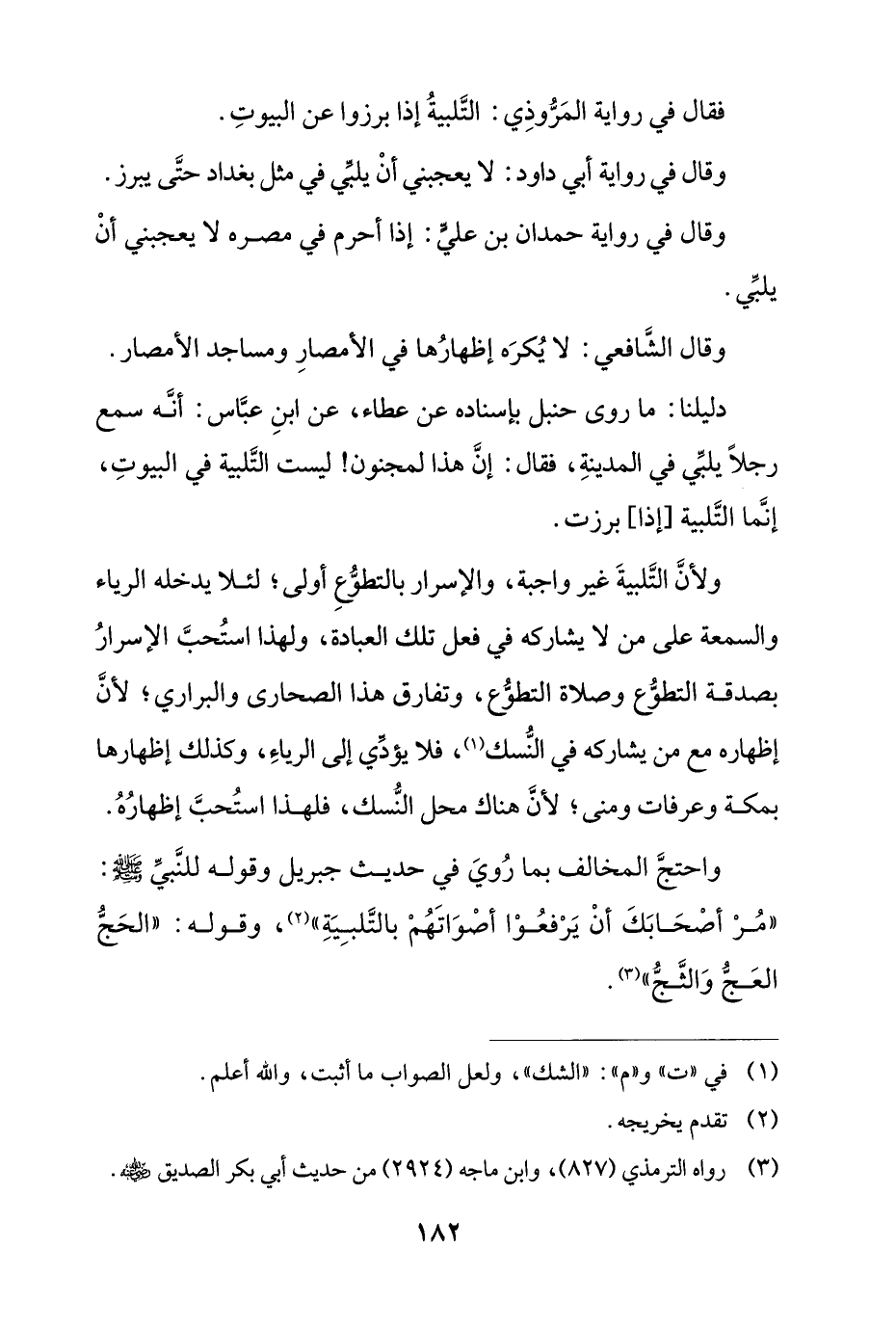 واحتج المخالف بما روي في حديث جبريل وقوله للنبي صلى الله عليه وسلم: ((مر أصحابك أن يرفعوا أصواتهم بالتلبية))، وقوله: ((الحج العج والثج)).