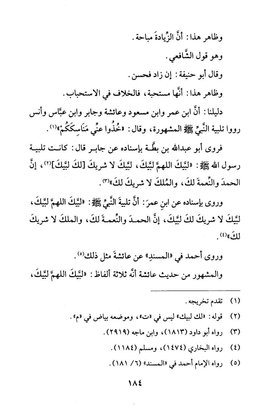وروى بإسناده عن ابن عمر: ان تلبية النبي صلى الله عليه وسلم: ((لبيك اللهم لبيك، لبيك لا شريك لك لبيك، إن الحمد والنعمة لك، والملك لا شريك لك)).