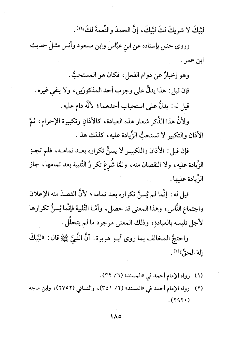 قيل له: إنما لم يسن تكراره بعد تمامه؛ لأن القصد منه الإعلان واجتماع الناس، وهذا لمعني قد حصل، وأما التلبية فإنما يسن تكرارها لأجل تلبسه بالعباد، وذلك المعنى موجود ما لم يتحلل.