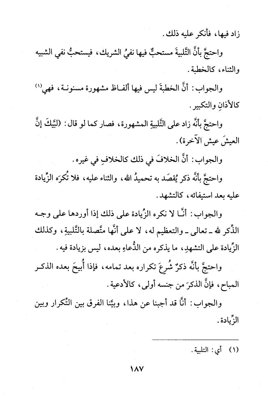 والجواب: أنا لا نكره الزيادة على ذلك إذا أوردها على وجه الذكر لله- تعالى- والتعظيم له، لا على أنها متصلة بالتلبية، وكذلك الزيادة على التشهد، ما يذكره من الدعاء بعده، ليس بزيادة فيه.