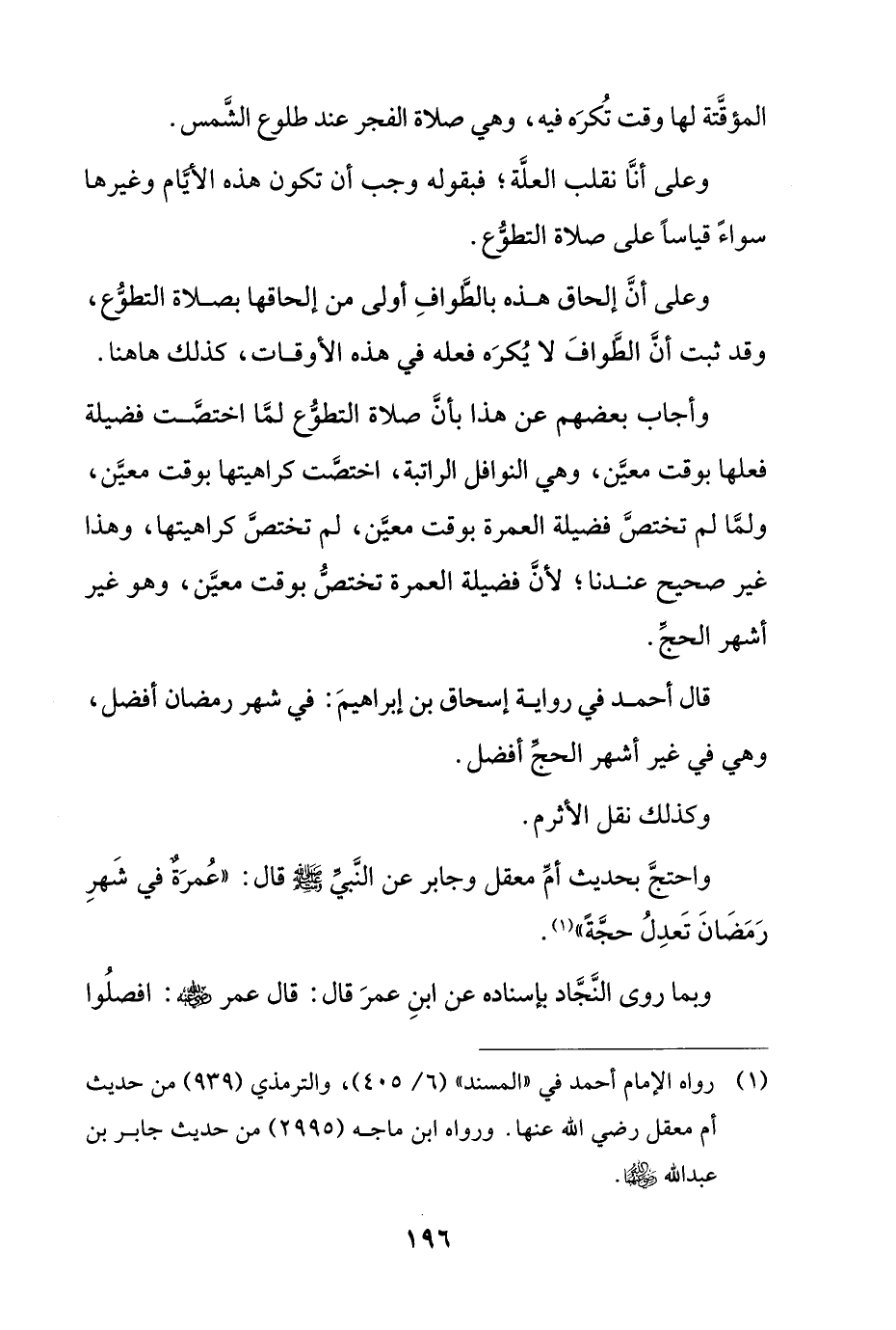 وأجاب بعضهم عن هذا بأن صلاة التطوع لما اختصت فضيلة فعلها بوقت معين، وهي النوافل الراتبة، اختصت كراهيتها بوقت معين، ولما لم تختص فضيلة العمرة بوقت معين، لم تختص كراهيتها، وهذا غير صحيح عندنا؛ لأن فضيلة العمرة تختص بوقت معين، وهو غير أشهر الحج.