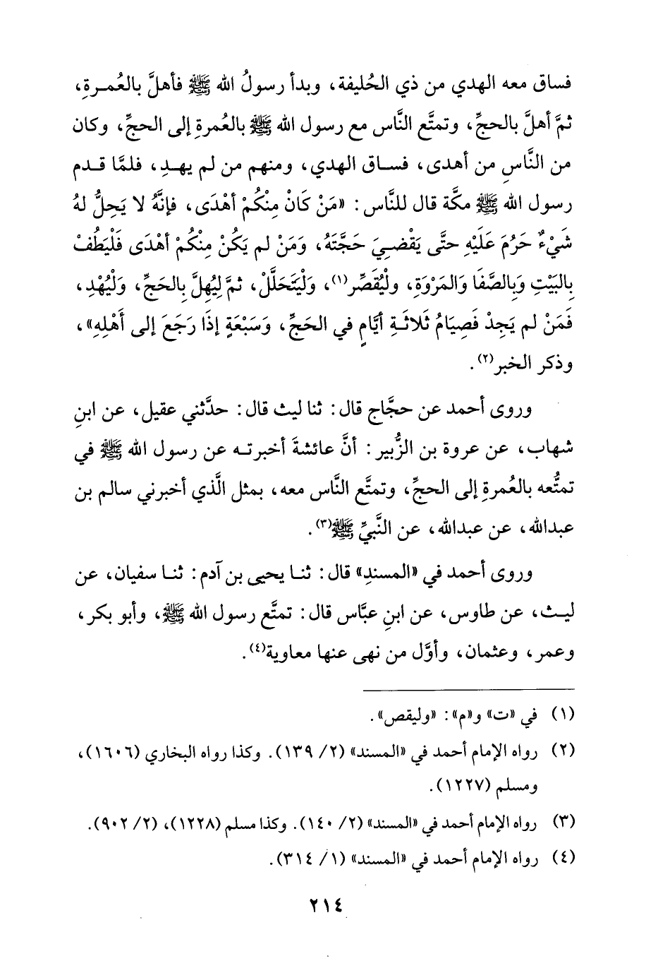 وروى أحمد عن حجاج قال: ثنا ليث قال: حدثني عقيل، عن ابن شهاب، عن عروة بن الزبير: أن عائشة أخبرته عن رسول الله صلى الله عليه وسلم في تمتعه بالعمرة إلى الحج، وتمتع الناس معه، بمثل الذي أخبرني سالم بن عبد الله، عن عبد الله، عن النبي صلى الله عليه وسلم.