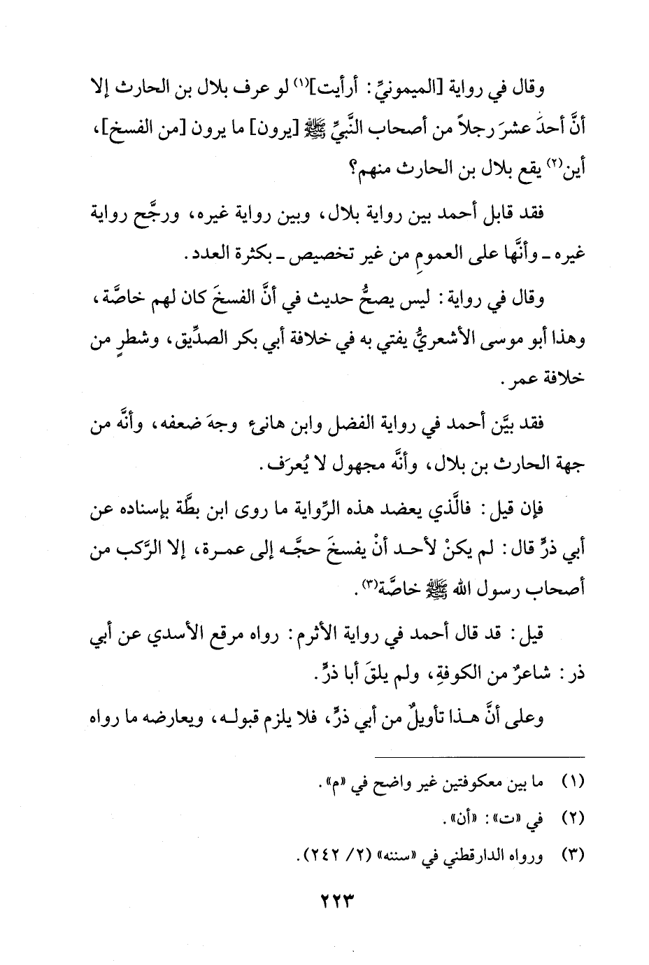 وقال في رواية [الميموني: أرأيت] لو عرف بلال بن الحارث إلا أن أحد عشر رجلًا من أصحاب النبي صلى الله عليه وسلم [يرون] ما يرون [من الفسخ] , أين يقع بلال بن الحارث منهم؟