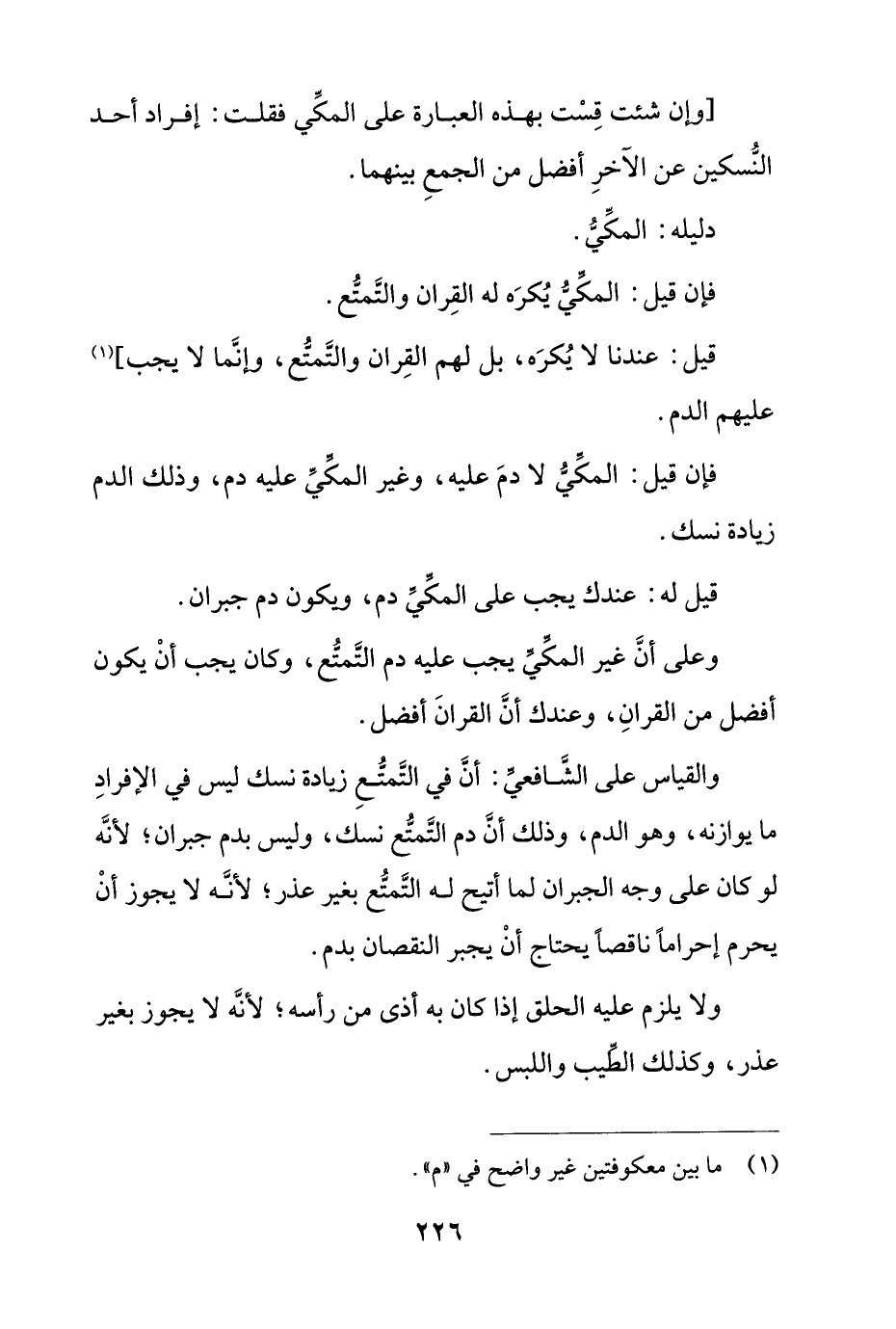 [وإن شئت قست بهذه العبارة على المكي فقلت: إفراد أحد النسكين عن الآخر أفضل من الجمع بينهما.