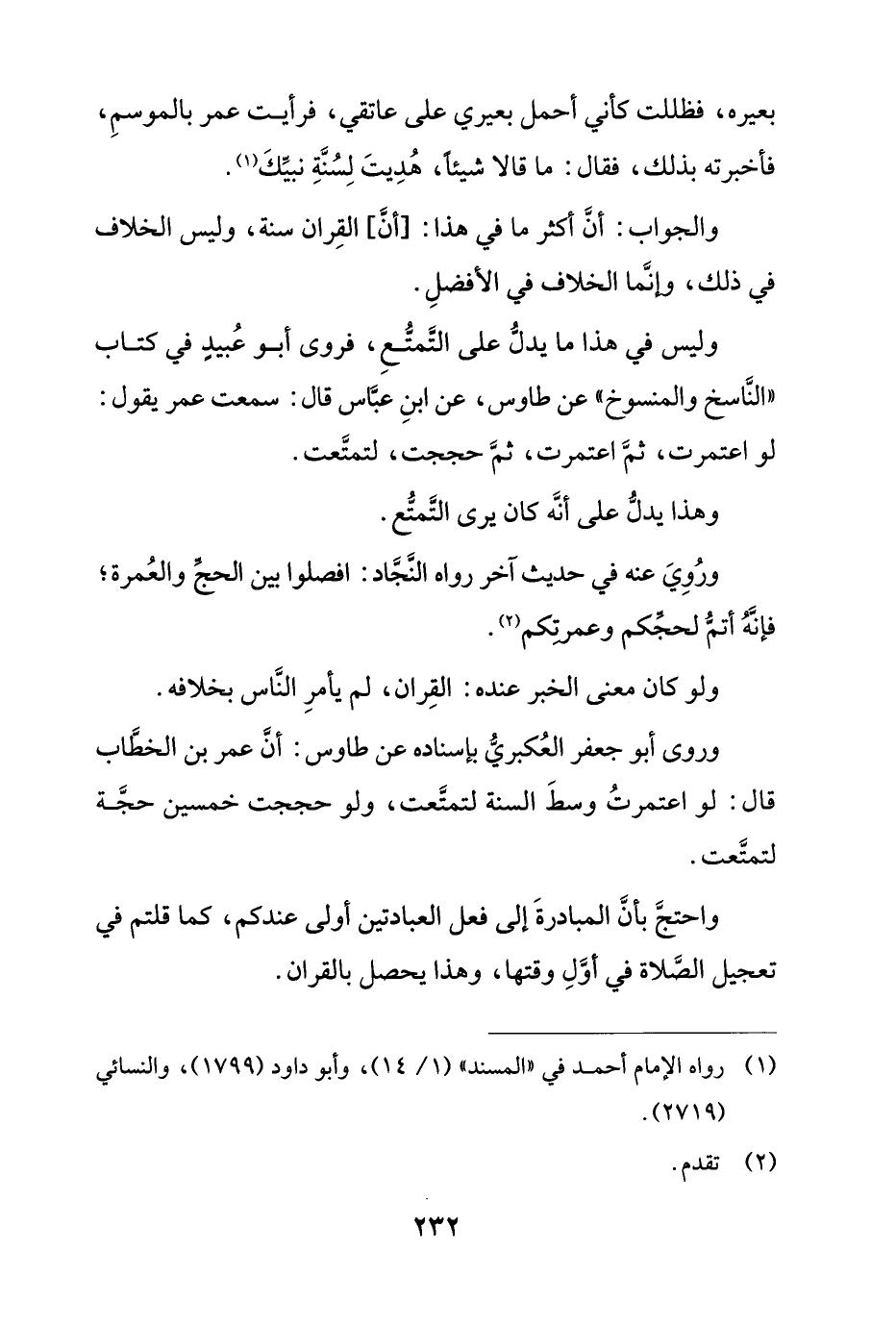 وليس في هذا ما يدل على التمتع، فروى أبو عبيد في كتاب "الناسخ والمنسوخ "عن طاوس، عن ابن عباس قال: سمعت عمر يقول: لو اعتمرت، ثم اعتمرت، ثم حججت، لتمتعت.