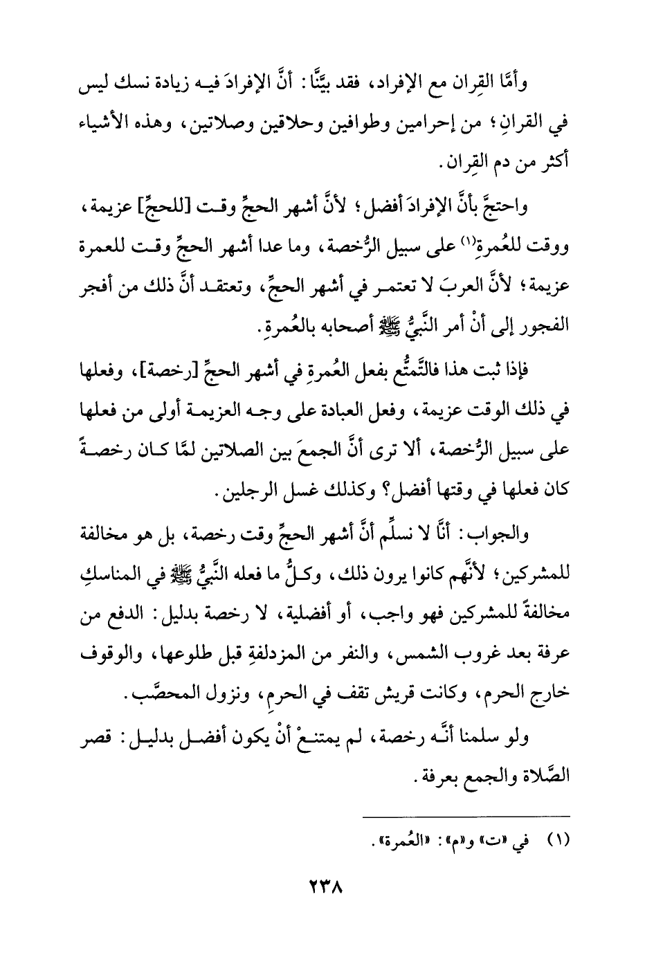 واحتج بأن الإفراد أفضل؛ لأن أشهر الحج وقت [للحج] عزيمة، ووقت للعمرة على سبيل الرخصة، وما عدا أشهر الحج وقت للعمرة عزيمة؛ لأن العرب لا تعتمر في أشهر الحج، وتعتقد أن ذلك من أفجر الفجور إلى أن أمر النبي صل الله عليه وسلم أصحابه بالعمرة.