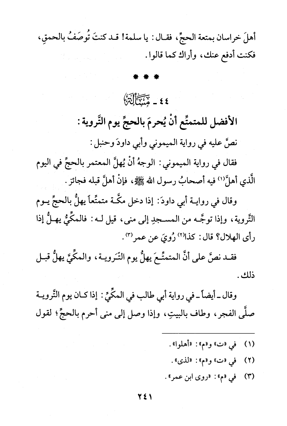 وقال- أيضًا- في رواية أبي طالب في المكي: إذا كان يوم التروية صلى الفجر، وطاف بالبيت، وإذا وصل إلى منى أحرم بالحج؛ لقول