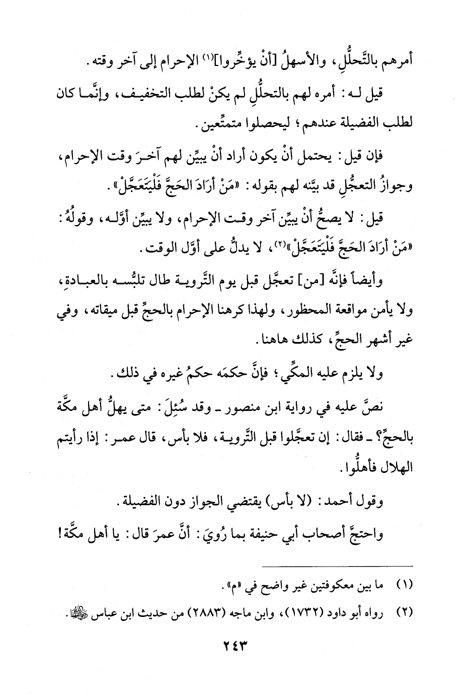 نص عليه في رواية ابن منصور- وقد سئل: متى يهل أهل مكة بالحج؟ - فقال: إن تعجلوا قبل التروية، فلا بأس، قال عمر: إذا رأيتم الهلال فأهلوا.
