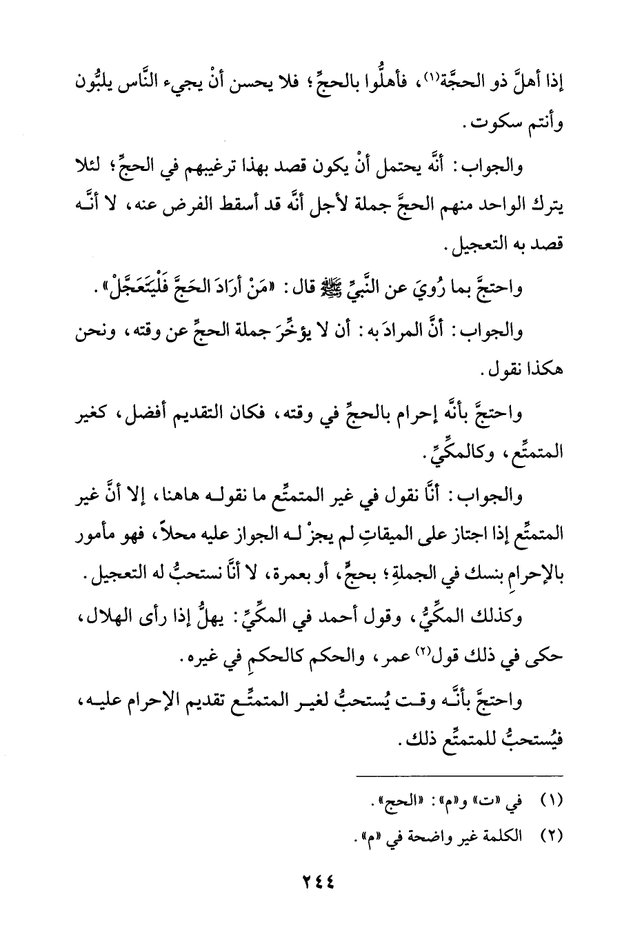 والجواب: أنا نقول في غير المتمتع ما نقوله هاهنا، إلا أن غير المتمتع إذا اجتاز على الميقات لم يجز له الجواز عليه محلاً، فهو مأمور بالإحرام بنسك في الجملة؛ بحج، أو بعمرة، لا أنا نستحب له التعجيل.