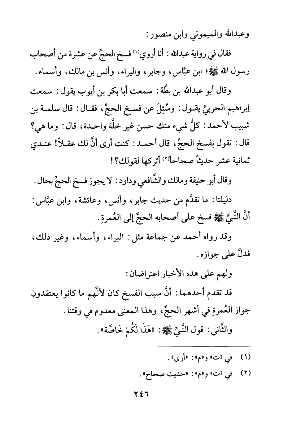 فقال في رواية عبد الله: أنا أروي فسخ الحج عن عشرة من أصحاب رسول الله صل الله عليه وسلم؛ ابن عباس، وجابر، والبراء، وأنس بن مالك، وأسماء.