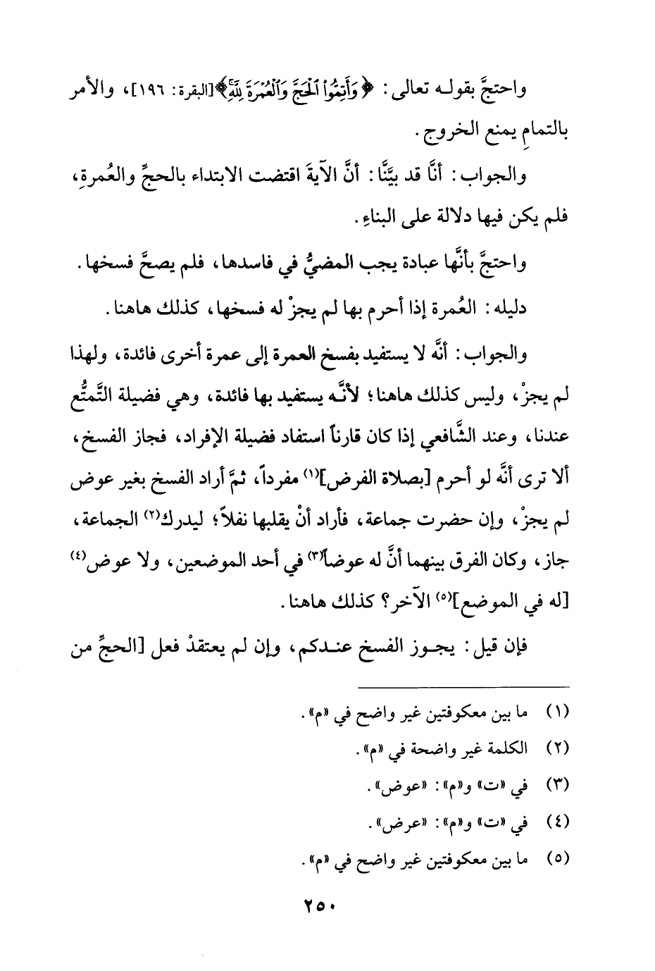والجواب: أنه لا يستفيد بفسخ العمرة إلى عمرة أخرى فائدة، ولهذا لم يجز، وليس كذلك هاهنا؛ لأنه يستفيد بها فائدة، وهي فضيلة التمتع عندنا، وعند الشافعي إذا كان قارنًا استفاد فضيلة الإفراد، فجاز الفسخ، ألا ترى أنه لو أحرم [بصلاة الفرض] مفردًا، ثم أراد الفسخ بغير عوض لم يجز، وإن حضرت جماعة، فأراد أن يقلبها نفلاً؛ ليدرك الجماعة، جاز، وكان الفرق بينهما أن له عوضًا في أحد الموضعين، ولا عوض [له في الموضع] الآخر؟ كذلك هاهنا.