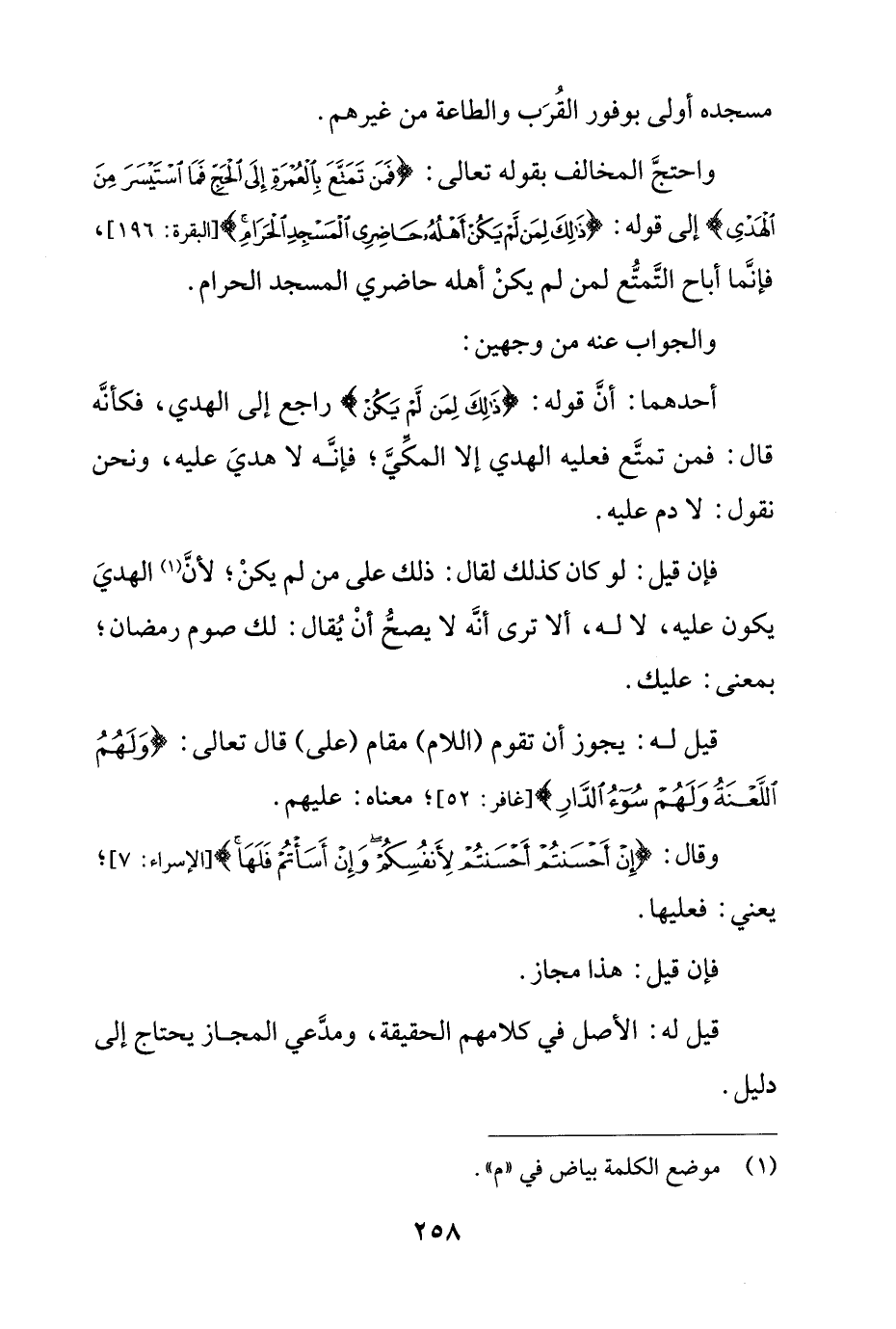 فإن قيل: لو كان كذلك لقال: ذلك على من لم يكن؛ لأن الهدي يكون عليه، لا له، ألا ترى أنه لا يصح أن يقال: لك صوم رمضان؛ بمعني: عليك.