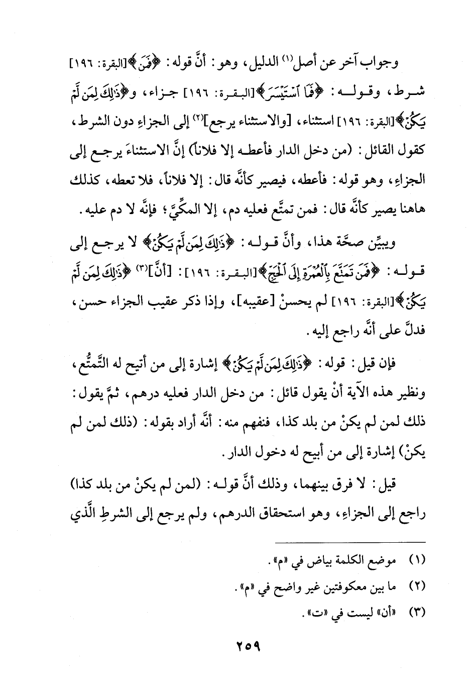 ويبين صحة هذا، وأن قوله:} ذَلِكَ لِمَن لَّمْ يَكُنْ {لا يرجع إلى قوله:} فَمَن تَمَتَّعَ بِالْعُمْرَةِ إِلَى الْحَجِّ {] البقرة: 196 [:] أن [} ذَلِكَ لِمَن لَّمْ يَكُنْ {] البقرة: 196 [لم يحسن] عقيبه [، وإذا ذكر عقيب الجزاء حسن، فدل على أنه راجع إليه.