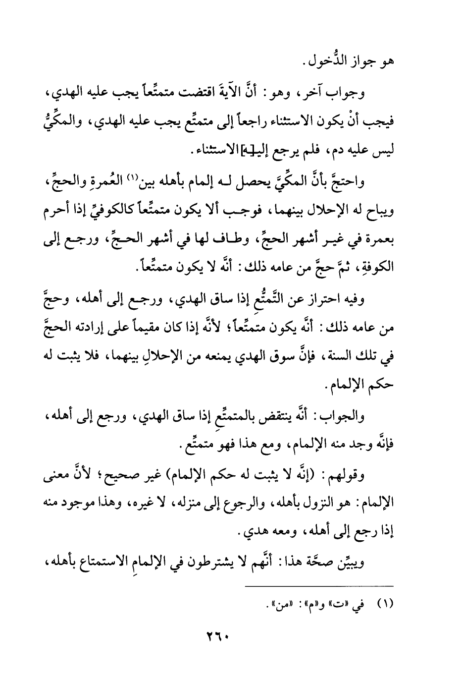 والجواب: أنه ينتقض بالمتمتع إذا ساق الهدي، ورجع أهله، فإنه وجد منه الإلمام، ومع هذا فهو متمتع.