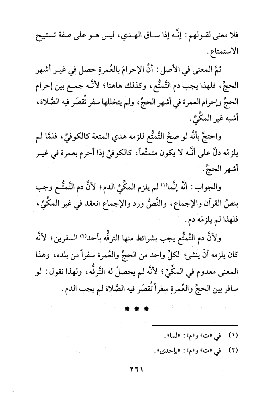 ولأن دم التمتع يجب بشرائط منها الترفه بأحد السفرين؛ لأنه كان يلزمه أن ينشئ لكل واحد من الحج والعمرة سفراً من بلده، وهذا المعنى معدوم في المكي؛ لأنه لم يحصل له الترفه، ولهذا نقول: لو سافر بين الحج والعمرة سفراً تقصر فيه الصلاة لم يجب الدم.