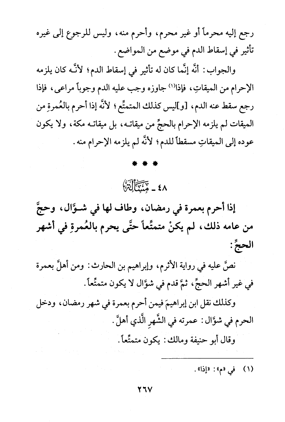 والجواب: أنه إنما كان له تأثير في إسقاط الدم؛ لأنه كان يلزمه الإحرام من الميقات، فإذا جاوزه وجب عليه الدم وجوباً مراعى، فإذا رجع سقط عنه الدم،] و [ليس كذلك المتمتع؛ لأنه إذا أحرم بالعمرة من الميقات لم يلزمه الإحرام بالحج من ميقاته، بل ميقاته مكة، ولا يكون عوده إلى الميقات مسقطاً للدم؛ لأنه لم يلزمه الإحرام منه.