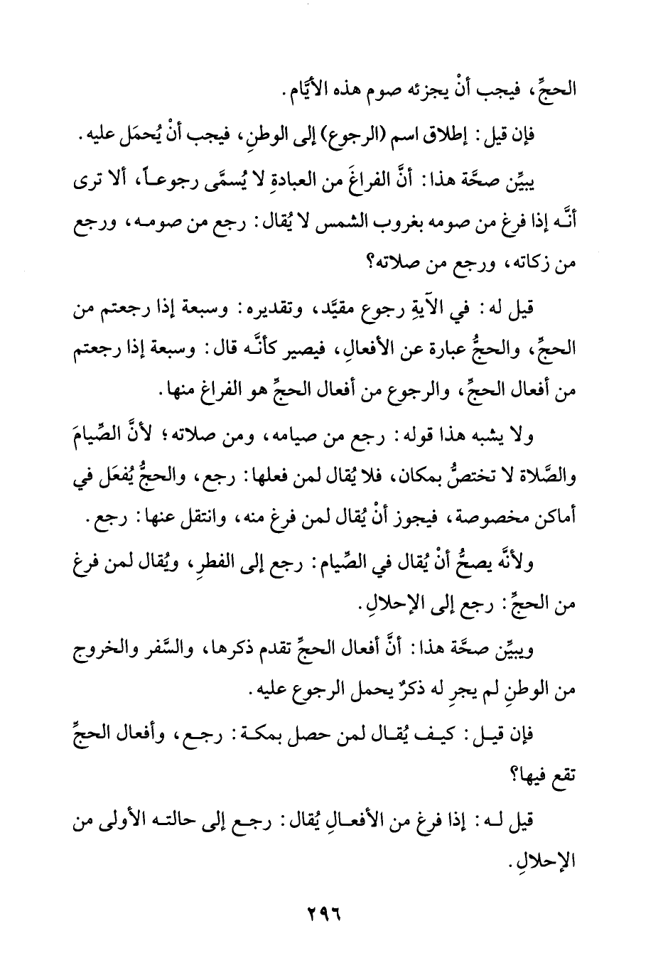 ولا يشبه هذا قوله: رجع من صيامه، ومن صلاته؛ لأن الصيام والصلاة لا تختص بمكان، فلا يقال لمن فعلها: رجع، والحج يفعل في أماكن مخصوصة، فيجوز أن يقال لمن فرغ منه، وانتقل عنها: رجع.