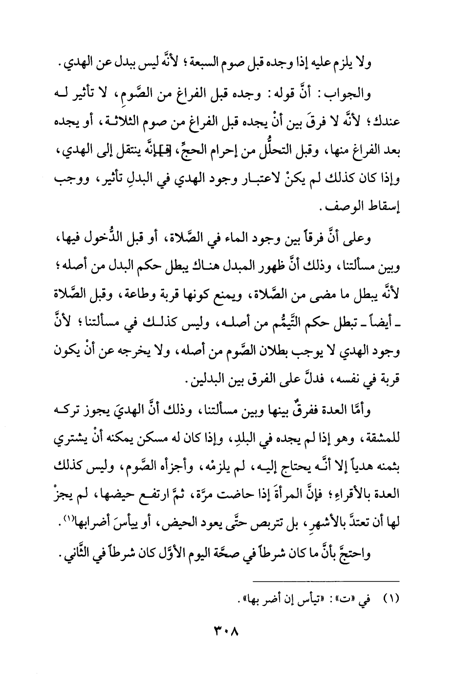 وعلى أن فرقاً بين وجود الماء في الصلاة، أو قبل الدخول فيها، وبين مسألتنا، وذلك أن ظهور المبدل هناك يبطل حكم البدل من أصله؛ لأنه يبطل ما مضى من الصلاة، ويمنع كونها قربة وطاعة، وقبل الصلاة - أيضاً - تبطل حكم التيمم من أصله، وليس كذلك في مسألتنا؛ لأن وجود الهدي لا يوجب بطلان الصوم من أصله، ولا يخرجه عن أن يكون قربة في نفسه، فدل على الفرق بين البدلين.